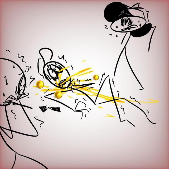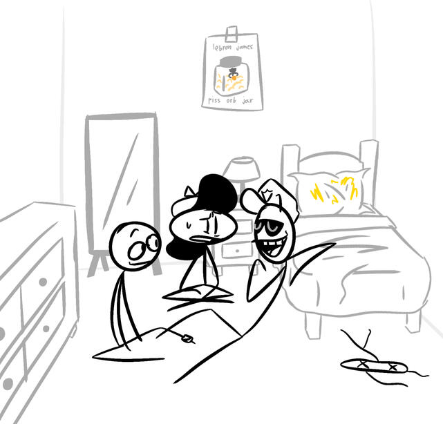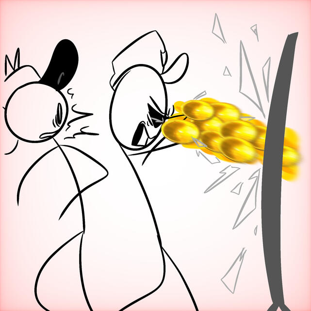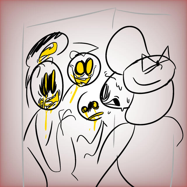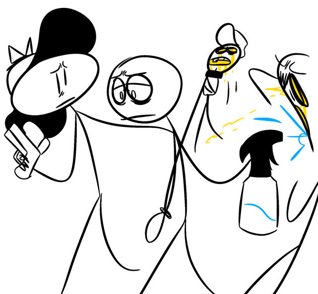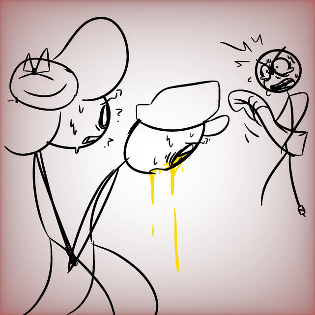 you hear a squeak coming from the mirror, and as you turn back, you see a bundle of piss orbs launching at you from behind it, Cop shielding you from the blast.